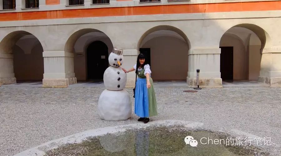 橘红色的大学庭院中有一个雪人。雪人前还特地设计有一滩水,如果不是因为当时是夏初之交,我都要觉得这是个真的雪人了。Sibylle告诉我们,为了把雪人做的栩栩如生,营造那种冻感,设计师还把大理石埋在阿尔卑斯山的雪地好久,虽然我不明白低温具体会给大理石带来什么形貌变化...