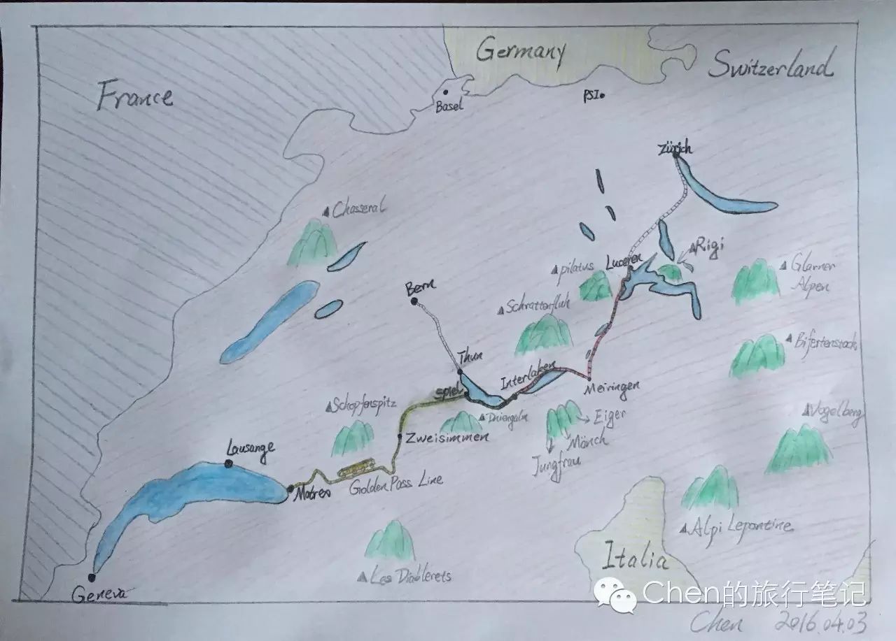 在瑞士坐火车游览是最好不过的了。瑞士人设计了几条观景线路,比如GoldenPass黄金列车,Bernina Express伯尔尼纳列车,Glacier Express冰川列车等(http://www.swisstravelsystem.com/en/highlights-en/grand-train-tour-of-switzerland.html)。这次我们选的是路线为Lucerne-Interlaken-Motreux的黄金列车。这条路线经过阿尔卑斯山脉中的许多高山湖泊,起始于Lucerne(卢塞恩),并且可以轻易换乘到Zürich(苏黎世),Bern (伯恩)和Lausanne(洛桑)。